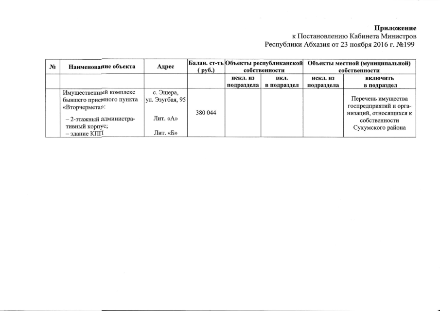 Постановление Кабинета Министров Республики Абхазия от 23.11.2016 № 199 "О передаче имущественного комплекса бывшего приемного пункта РУП "Абхазвторресурсы" в муниципальную собственность Сухумского района"