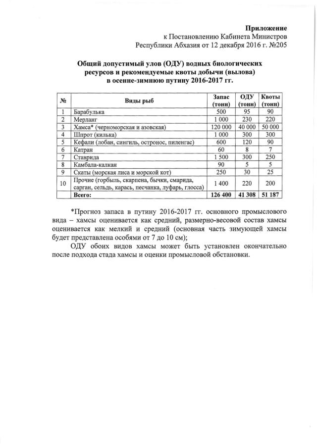 Постановление Кабинета Министров Республики Абхазия от 12.12.2016 № 205 "Об утверждении "Общего допустимого улова (ОДУ) водных биологических ресурсов и рекомендуемых квот добычи (вылова) в осенне-зимнюю путину 2016-2017 гг."