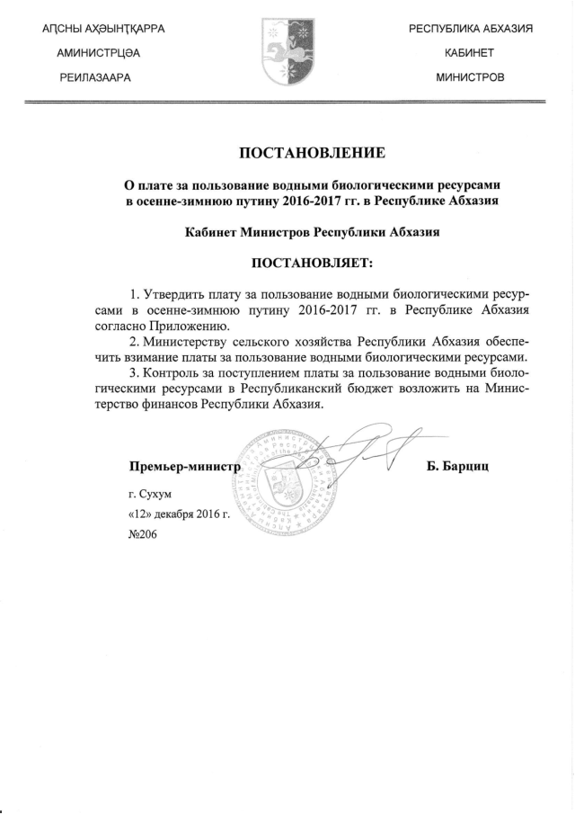 Постановление Кабинета Министров Республики Абхазия от 12.12.2016 № 206 "О плате за пользование водными биологическими ресурсами в осенне-зимнюю путину 2016-2017 гг. в Республике Абхазия"