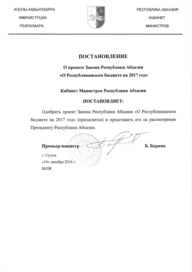 Постановление Кабинета Министров Республики Абхазия от 14.12.2016 № 208 "О проекте Закона Республики Абхазия "О Республиканском бюджете на 2017 год"