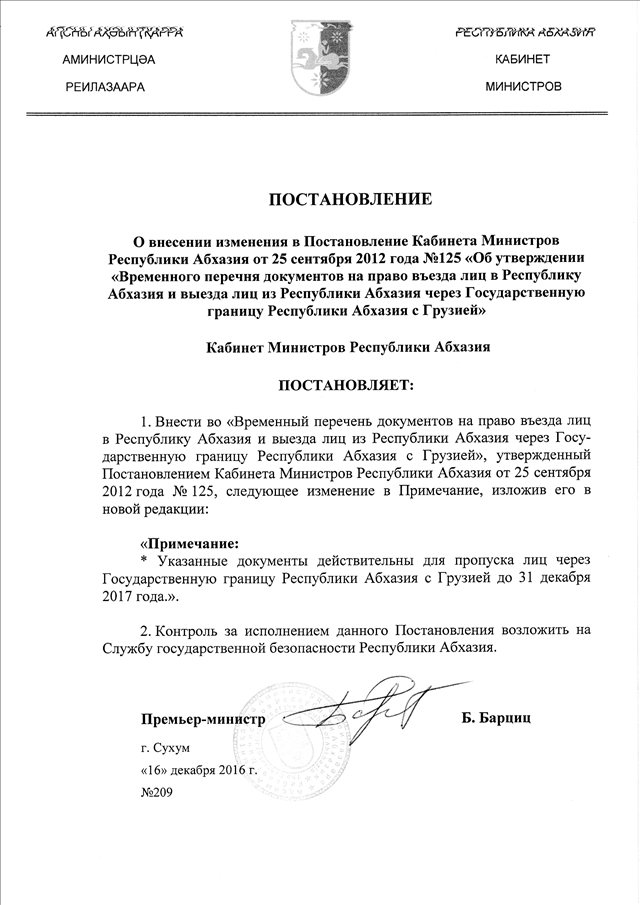 Постановление Кабинета Министров Республики Абхазия от 16.12.2016 № 209 "О внесении изменения в Постановление Кабинета Министров Республики Абхазия от 25 сентября 2012 года № 125 "Об утверждении "Временного перечня документов на право въезда лиц в Республику Абхазия и выезда лиц из Республики Абхазия через Государственную границу Республики Абхазия с Грузией"