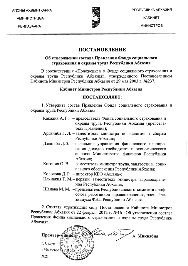 Постановление Кабинета Министров Республики Абхазия от 25.02.2016 № 21 "Об утверждении состава Правления Фонда социального страхования и охраны труда Республики Абхазия"