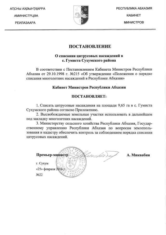 Постановление Кабинета Министров Республики Абхазия от 25.02.2016 № 22 "О списании цитрусовых насаждений в с. Гумиста Сухумского района"