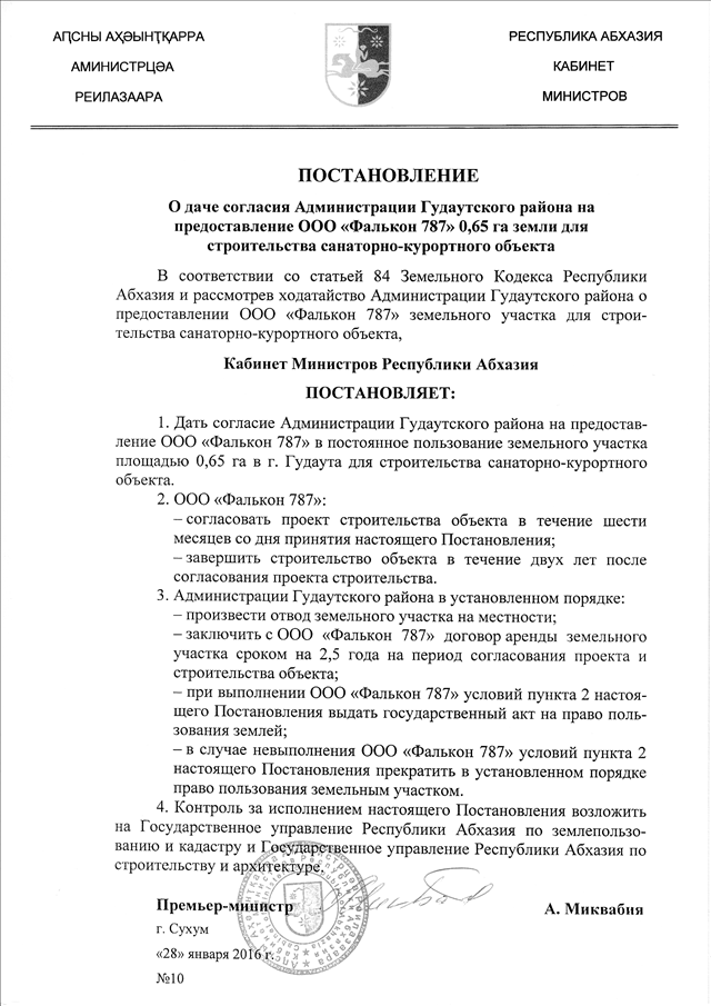 Постановление Кабинета Министров Республики Абхазия от 28.01.2016 № 10 "О даче согласия Администрации Гудаутского района на предоставление ООО "Фалькон 787" 0,65 га земли для строительства санаторно-курортного объекта"