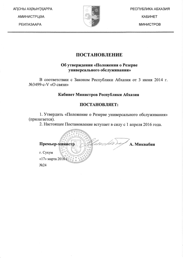 Постановление Кабинета Министров Республики Абхазия от 17.03.2016 № 24 "Об утверждении "Положения о Резерве универсального обслуживания"