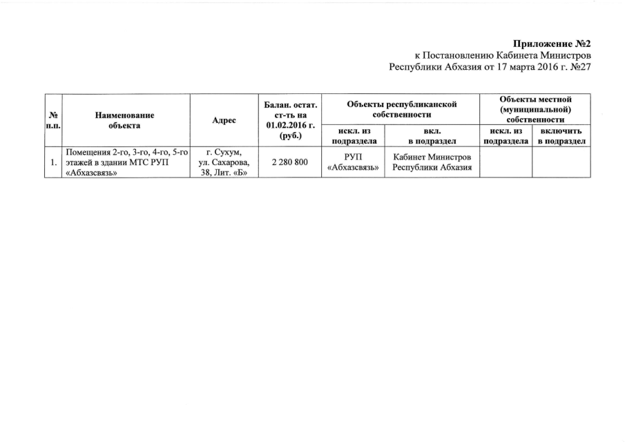 Постановление Кабинета Министров Республики Абхазия от 17.03.2016 № 27 "О передаче Аппарату Кабинета Министров Республики Абхазия помещений в здании МТС Республиканского унитарного предприятия "Абхазсвязь"