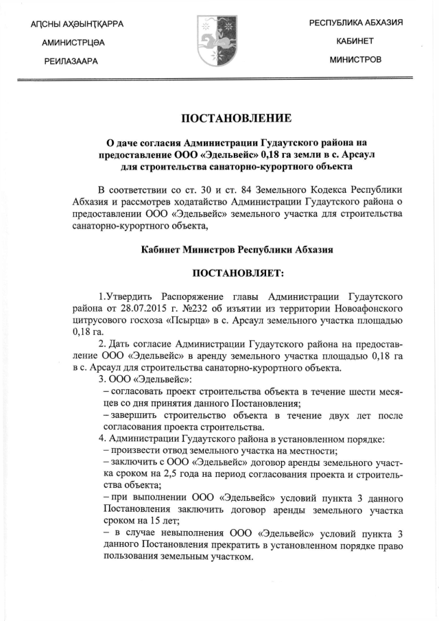 Постановление Кабинета Министров Республики Абхазия от 17.03.2016 № 29 "О даче согласия Администрации Гудаутского района на предоставление ООО "Эдельвейс" 0,18 га земли в с. Арсаул для строительства санаторно-курортного объекта"