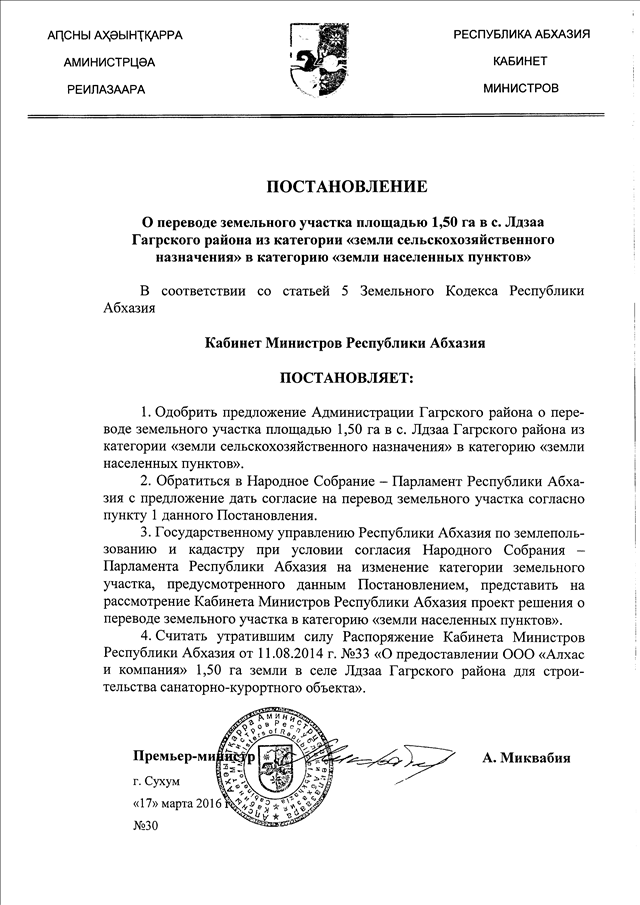 Постановление Кабинета Министров Республики Абхазия от 17.03.2016 № 30 "О переводе земельного участка площадью 1,50 га в с. Лдзаа Гагрского района из категории "земли сельскохозяйственного назначения" в категорию "земли населенных пунктов"