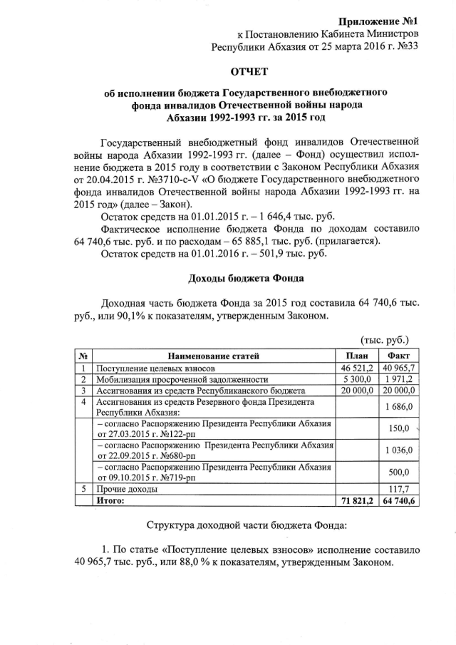 Постановление Кабинета Министров Республики Абхазия от 25.03.2016 № 33 "Об исполнении бюджета Государственного внебюджетного фонда инвалидов Отечественной войны народа Абхазии 1992-1993 гг. за 2015 год"