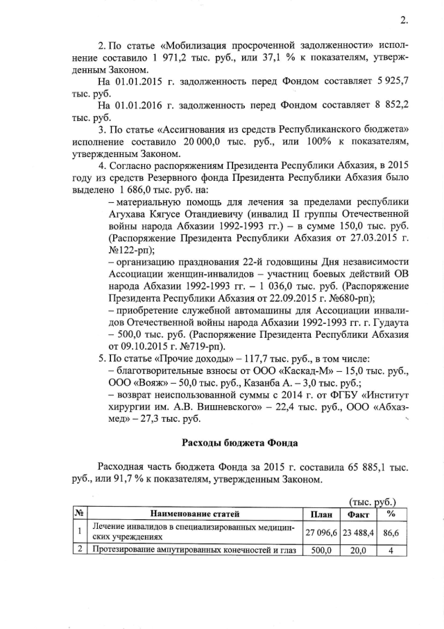 Постановление Кабинета Министров Республики Абхазия от 25.03.2016 № 33 "Об исполнении бюджета Государственного внебюджетного фонда инвалидов Отечественной войны народа Абхазии 1992-1993 гг. за 2015 год"
