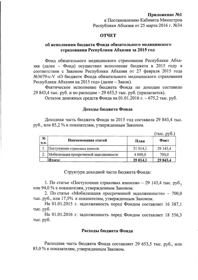 Постановление Кабинета Министров Республики Абхазия от 25.03.2016 № 34 "Об исполнении бюджета Фонда обязательного медицинского страхования Республики Абхазия за 2015 год"