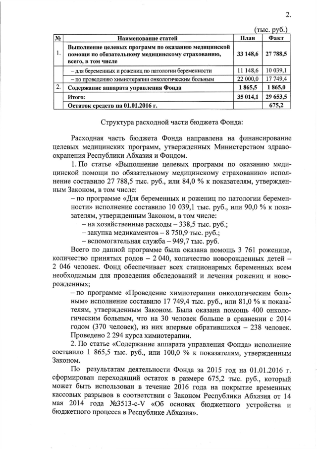 Постановление Кабинета Министров Республики Абхазия от 25.03.2016 № 34 "Об исполнении бюджета Фонда обязательного медицинского страхования Республики Абхазия за 2015 год"