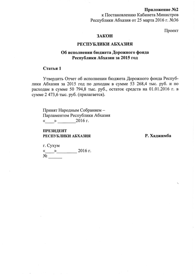 Постановление Кабинета Министров Республики Абхазия от 25.03.2016 № 36 "Об исполнении бюджета Дорожного фонда Республики Абхазия за 2015 год"