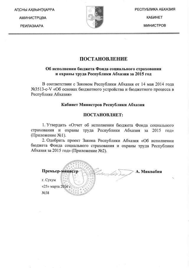 Постановление Кабинета Министров Республики Абхазия от 25.03.2016 № 38 "Об исполнении бюджета Фонда социального страхования и охраны труда Республики Абхазия за 2015 год"
