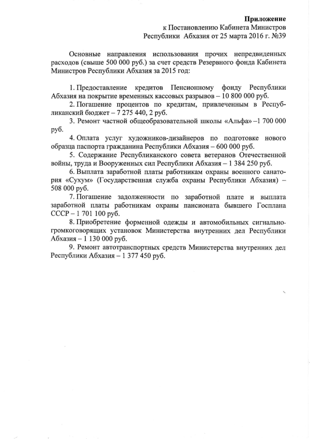Постановление Кабинета Министров Республики Абхазия от 25.03.2016 № 39 "Отчет об использовании средств Резервного фонда Кабинета Министров Республики Абхазия за 2015 год"