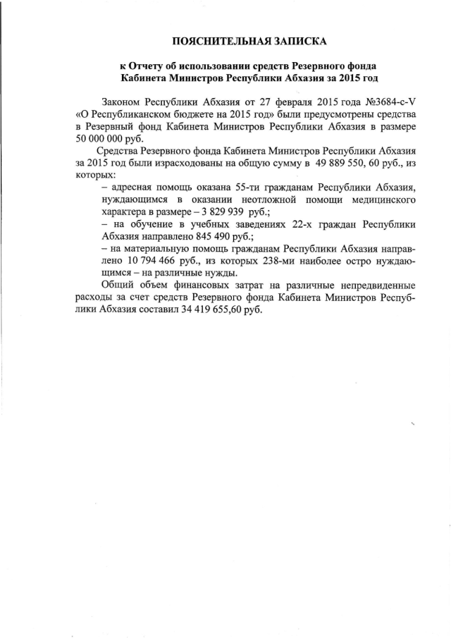 Постановление Кабинета Министров Республики Абхазия от 25.03.2016 № 39 "Отчет об использовании средств Резервного фонда Кабинета Министров Республики Абхазия за 2015 год"