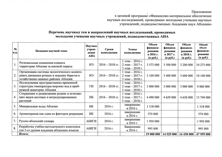 Постановление Кабинета Министров Республики Абхазия от 19.04.2016 № 42 "Об утверждении целевой программы "Финансово-материальное обеспечение научных исследований, проводимых молодыми учеными научных учреждений, подведомственных Академии наук Абхазии"