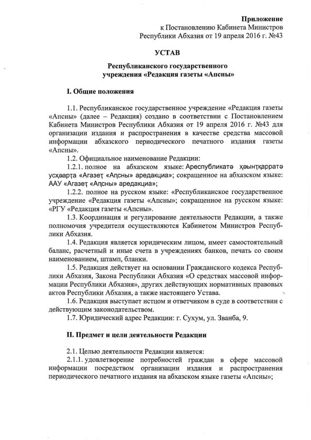 Постановление Кабинета Министров Республики Абхазия от 19.04.2016 № 43 "О Республиканском государственном учреждении "Редакция газеты "Апсны"