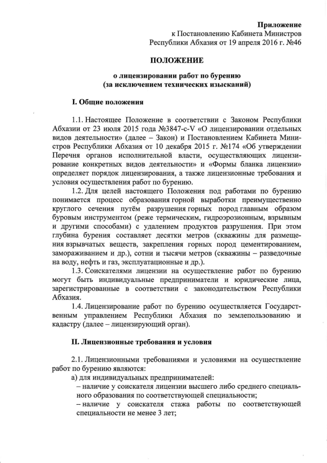 Постановление Кабинета Министров Республики Абхазия от 19.04.2016 № 46 "Об утверждении "Положения о лицензировании работ по бурению (за исключением технических изысканий)"