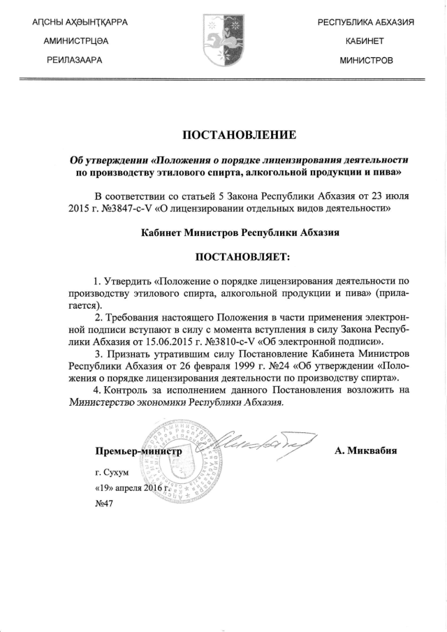 Постановление Кабинета Министров Республики Абхазия от 19.04.2016 № 47 "Об утверждении "Положения о порядке лицензирования деятельности по производству этилового спирта, алкогольной продукции и пива"