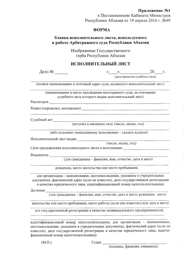 Постановление Кабинета Министров Республики Абхазия от 19.04.2016 № 49 "Об утверждении Формы бланка исполнительного листа, используемого в работе Арбитражного суда Республики Абхазия, порядка изготовления, учета, хранения и уничтожения бланков"