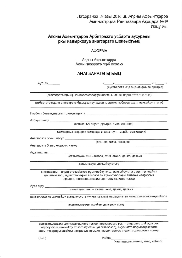 Постановление Кабинета Министров Республики Абхазия от 19.04.2016 № 49 "Об утверждении Формы бланка исполнительного листа, используемого в работе Арбитражного суда Республики Абхазия, порядка изготовления, учета, хранения и уничтожения бланков"