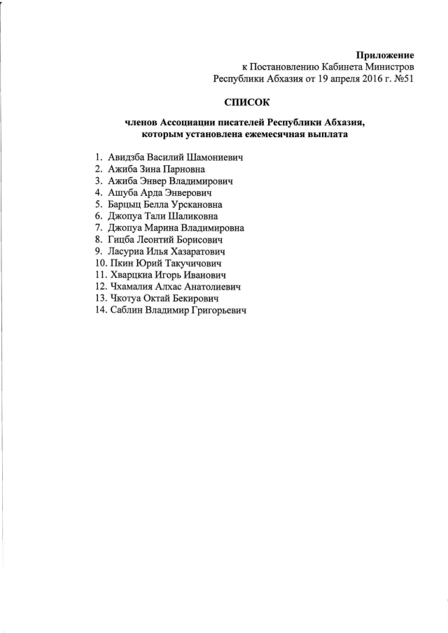 Постановление Кабинета Министров Республики Абхазия от 19.04.2016 № 51 "Об установлении ежемесячных выплат членам Ассоциации писателей Республики Абхазия"