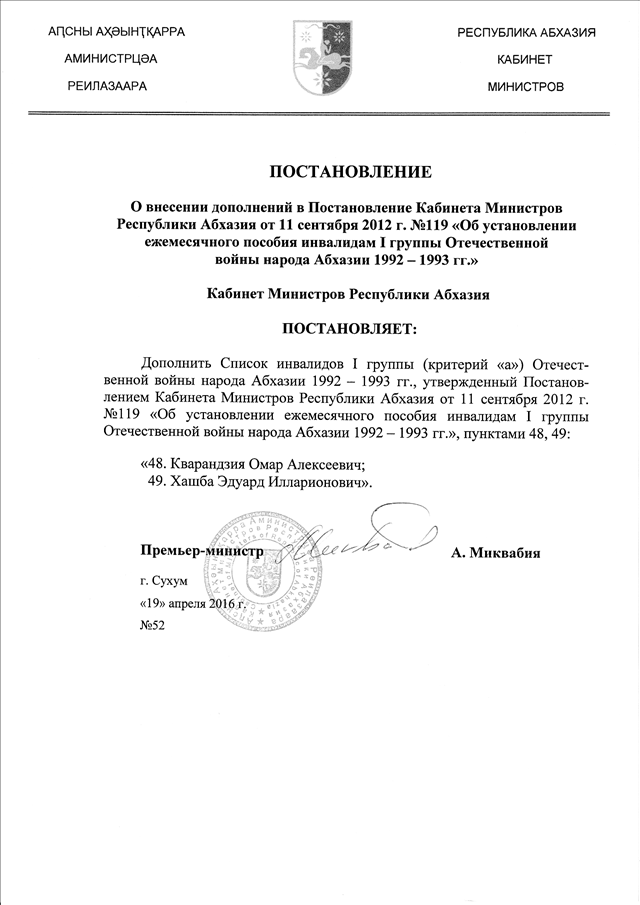 Постановление Кабинета Министров Республики Абхазия от 19.04.2016 № 52 "О внесении дополнений в Постановление Кабинета Министров Республики Абхазия от 11 сентября 2012 г. № 119 "Об установлении ежемесячного пособия инвалидам I группы Отечественной войны народа Абхазии 1992-1993 гг."