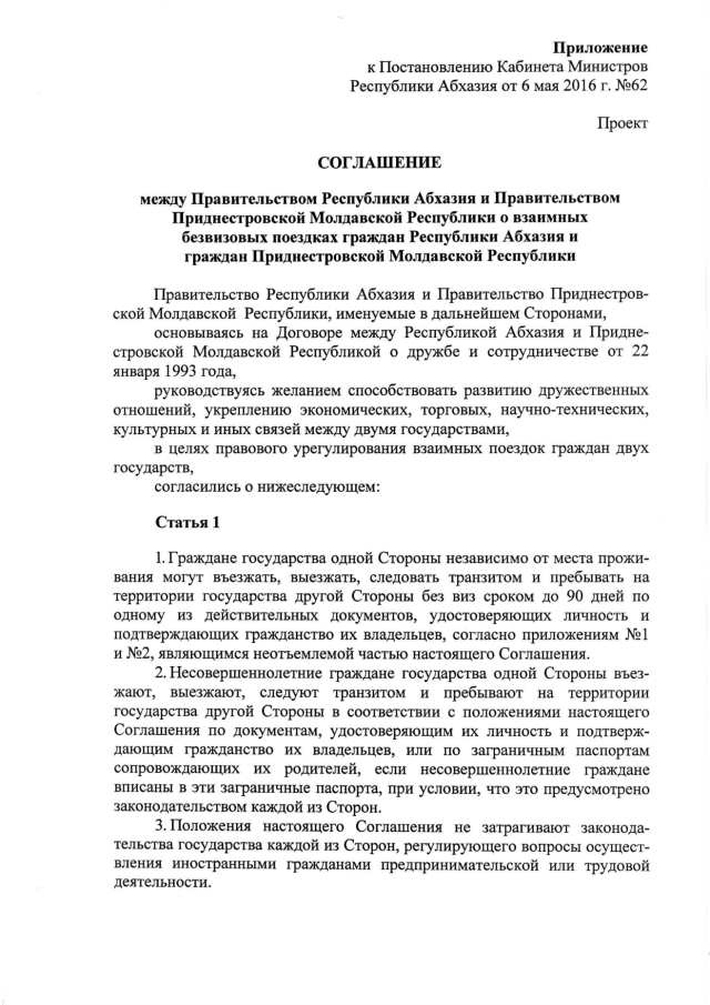 Постановление Кабинета Министров Республики Абхазия от 06.05.2016 № 62 "О проекте Соглашения меяеду Правительством Республики Абхазия и Правительством Приднестровской Молдавской Республики о взаимных безвизовых поездках граждан Республики Абхазия и граждан Приднестровской Молдавской Республики"