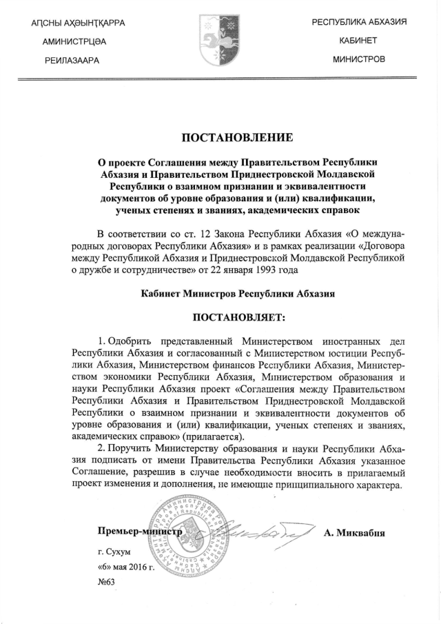 Постановление Кабинета Министров Республики Абхазия от 06.05.2016 № 63 "О проекте Соглашения между Правительством Республики Абхазия и Правительством Приднестровской Молдавской Республики о взаимном признании и эквивалентности документов об уровне образования и (или) квалификации, ученых степенях и званиях, академических справок"