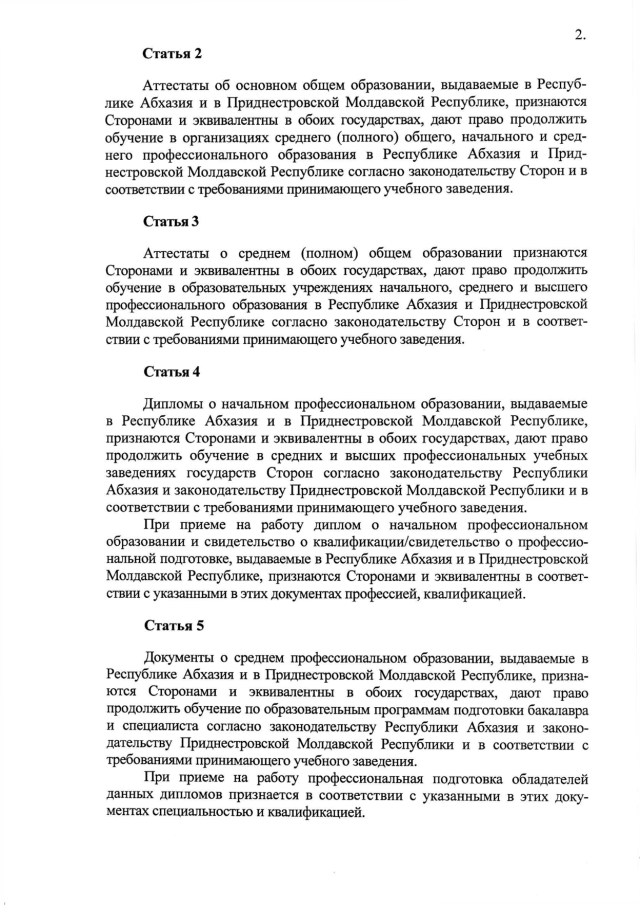 Постановление Кабинета Министров Республики Абхазия от 06.05.2016 № 63 "О проекте Соглашения между Правительством Республики Абхазия и Правительством Приднестровской Молдавской Республики о взаимном признании и эквивалентности документов об уровне образования и (или) квалификации, ученых степенях и званиях, академических справок"