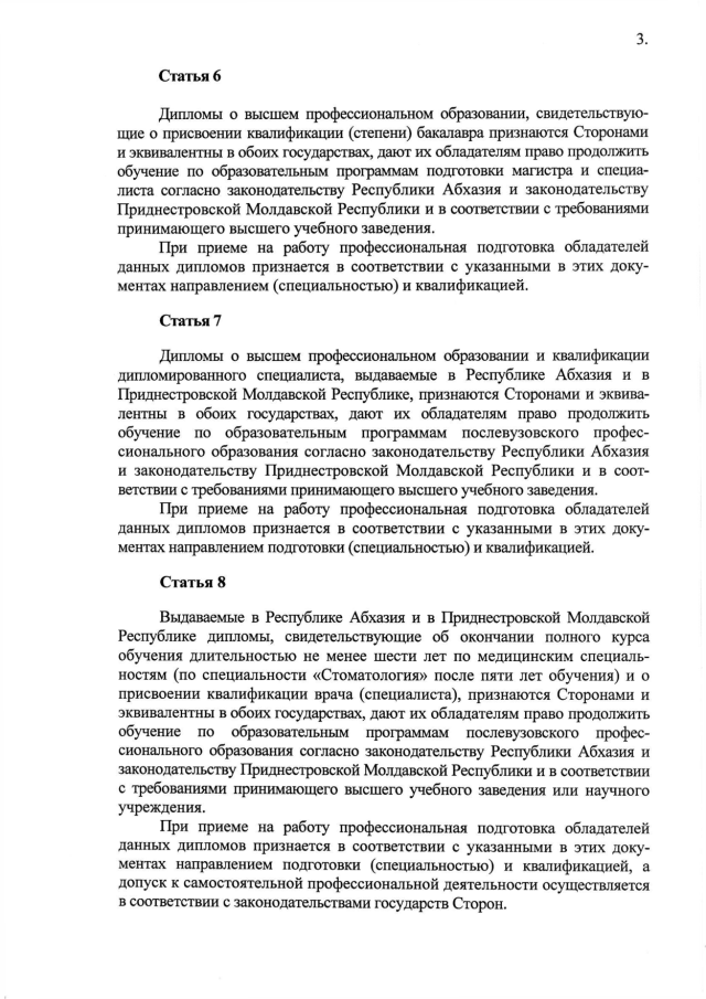 Постановление Кабинета Министров Республики Абхазия от 06.05.2016 № 63 "О проекте Соглашения между Правительством Республики Абхазия и Правительством Приднестровской Молдавской Республики о взаимном признании и эквивалентности документов об уровне образования и (или) квалификации, ученых степенях и званиях, академических справок"