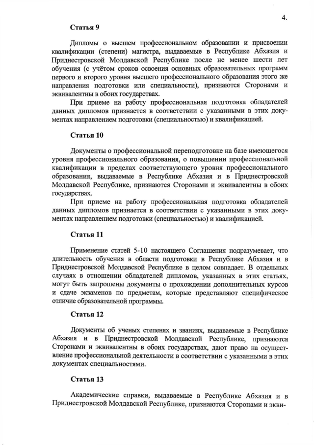 Постановление Кабинета Министров Республики Абхазия от 06.05.2016 № 63 "О проекте Соглашения между Правительством Республики Абхазия и Правительством Приднестровской Молдавской Республики о взаимном признании и эквивалентности документов об уровне образования и (или) квалификации, ученых степенях и званиях, академических справок"