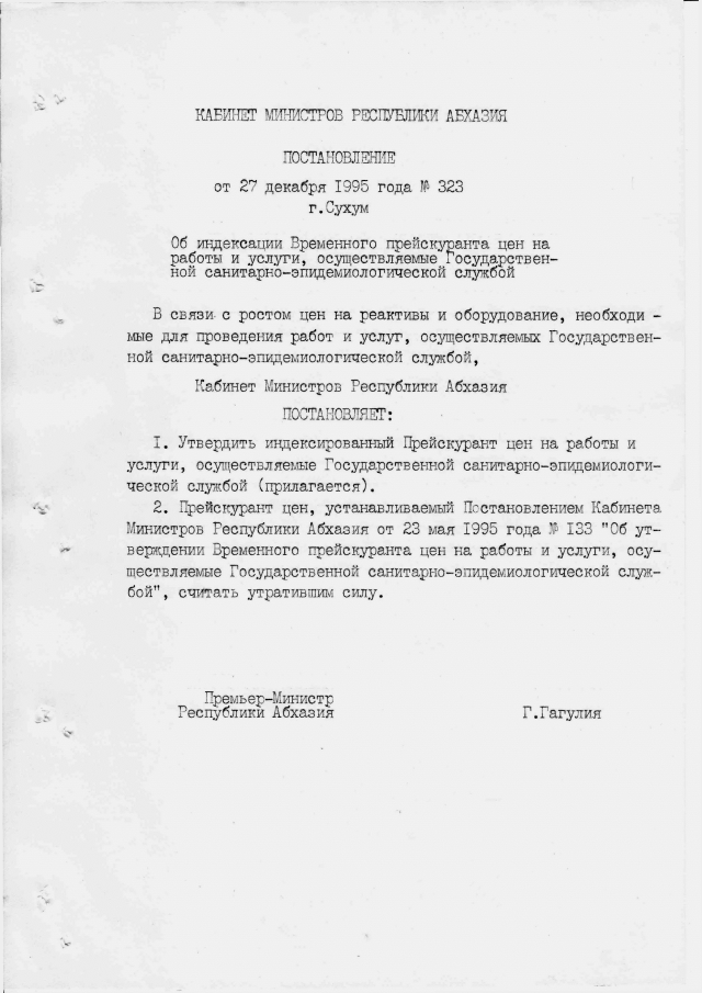 Постановление Кабинета Министров Республики Абхазия от 27.12.1995 № 323 "Об индексации Временного прейскуранта цен на работы и услуги, осуществляемые Государственной санитарно-эпидемиологической службой"