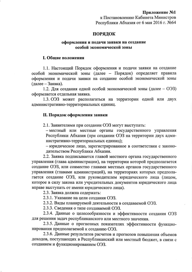 Постановление Кабинета Министров Республики Абхазия от 06.05.2016 № 64 "Об утверждении "Порядка оформления и подачи заявки на создание особой экономической зоны" и "Перечня документов, прилагаемых к заявке на создание особой экономической зоны"