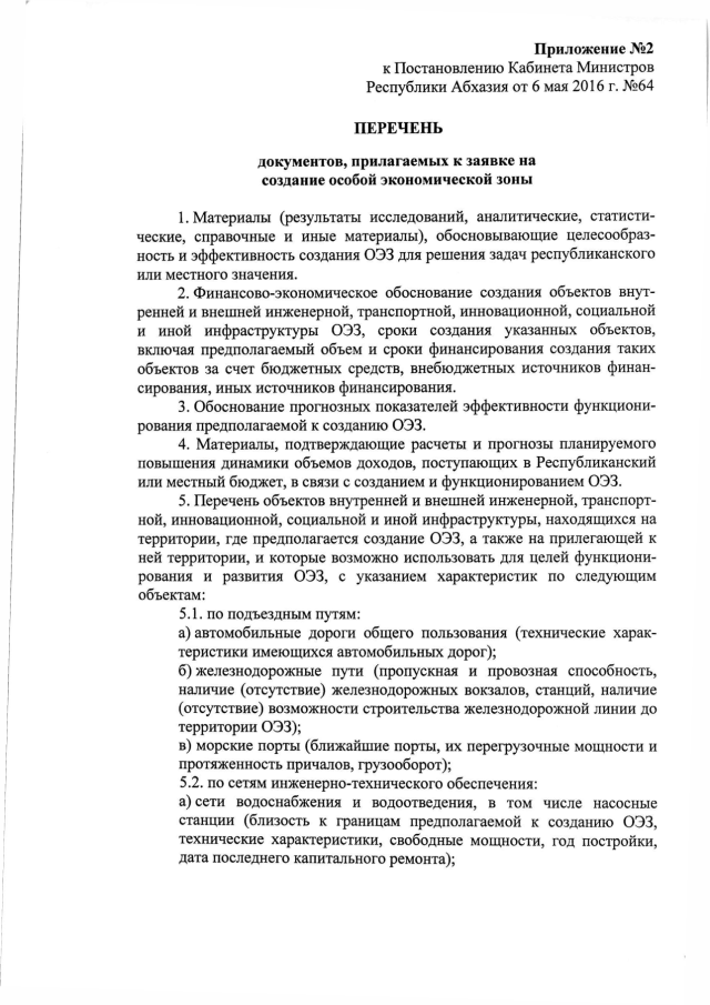 Постановление Кабинета Министров Республики Абхазия от 06.05.2016 № 64 "Об утверждении "Порядка оформления и подачи заявки на создание особой экономической зоны" и "Перечня документов, прилагаемых к заявке на создание особой экономической зоны"