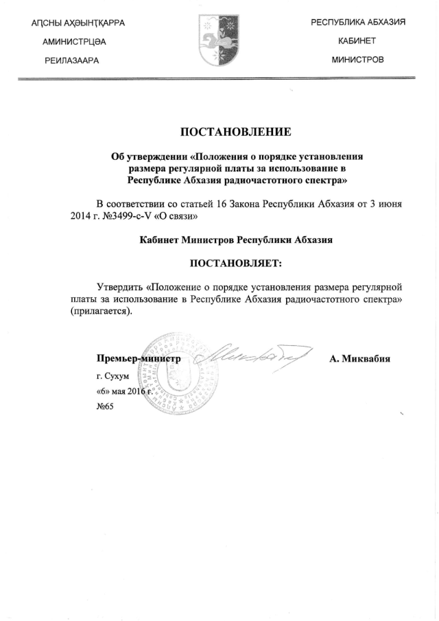 Постановление Кабинета Министров Республики Абхазия от 06.05.2016 № 65 "Об утверждении "Положения о порядке установления размера регулярной платы за использование в Республике Абхазия радиочастотного спектра"