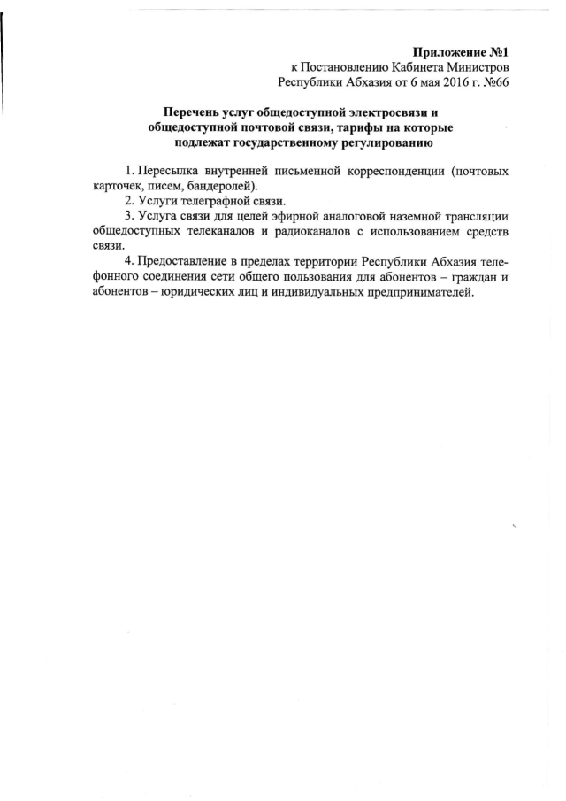Постановление Кабинета Министров Республики Абхазия от 06.05.2016 № 66 "О государственном регулировании тарифов на услуги общедоступной электросвязи и общедоступной почтовой связи"
