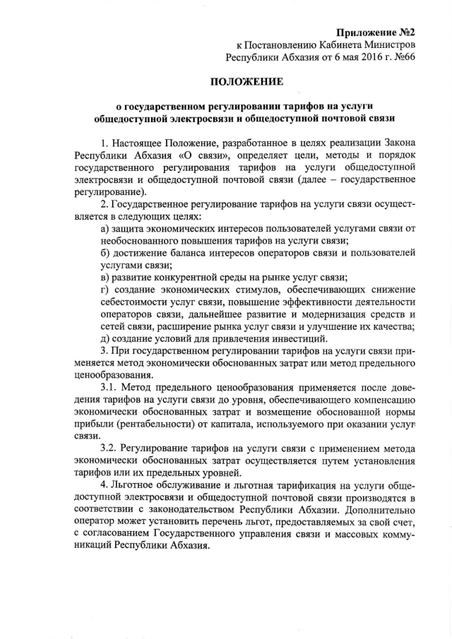 Постановление Кабинета Министров Республики Абхазия от 06.05.2016 № 66 "О государственном регулировании тарифов на услуги общедоступной электросвязи и общедоступной почтовой связи"