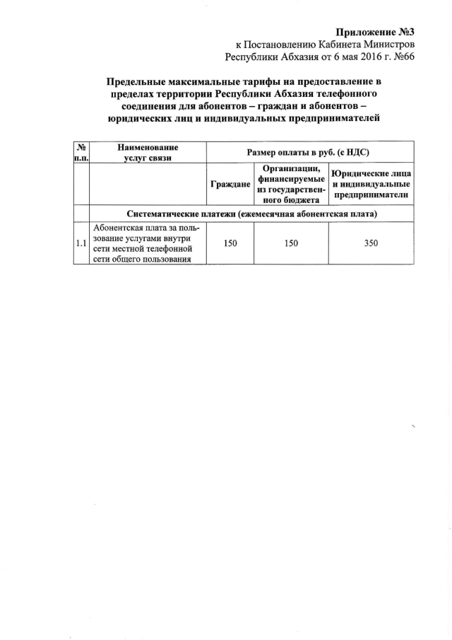 Постановление Кабинета Министров Республики Абхазия от 06.05.2016 № 66 "О государственном регулировании тарифов на услуги общедоступной электросвязи и общедоступной почтовой связи"