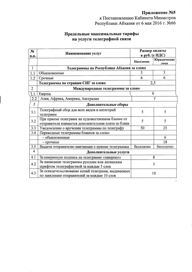Постановление Кабинета Министров Республики Абхазия от 06.05.2016 № 66 "О государственном регулировании тарифов на услуги общедоступной электросвязи и общедоступной почтовой связи"