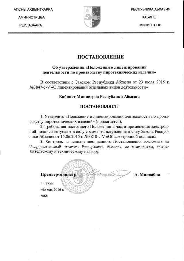 Постановление Кабинета Министров Республики Абхазия от 06.05.2016 № 68 "Об утверждении "Положения о лицензировании деятельности по производству пиротехнических изделий"