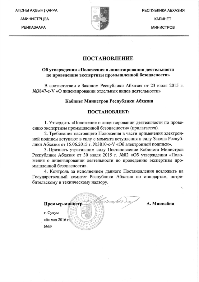 Постановление Кабинета Министров Республики Абхазия от 06.05.2016 № 69 "Об утверждении "Положения о лицензировании деятельности по проведению экспертизы промышленной безопасности"