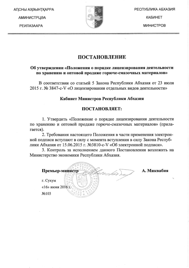 Постановление Кабинета Министров Республики Абхазия от 16.06.2016 № 103 "Об утверждении "Положения о порядке лицензирования деятельности по хранению и оптовой продаже горюче-смазочных материалов"