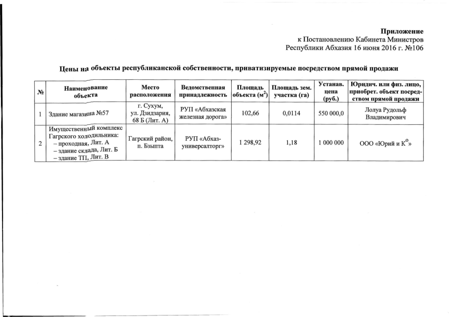 Постановление Кабинета Министров Республики Абхазия от 16.06.2016 № 106 "Об установлении цен на объекты республиканской собственности, приватизируемые посредством прямой продажи, и о выдаче свидетельств о собственности"