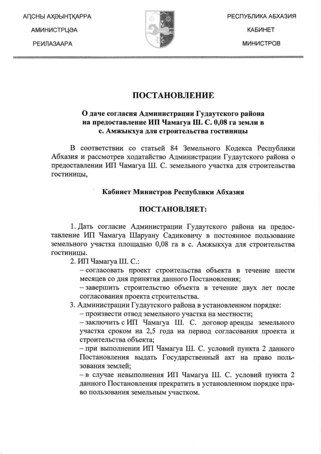 Постановление Кабинета Министров Республики Абхазия от 16.06.2016 № 108 "О даче согласия Администрации Гудаутского района на предоставление ИП Чамагуа Ш.С. 0,08 га земли в с. Амжыкхуа для строительства гостиницы"