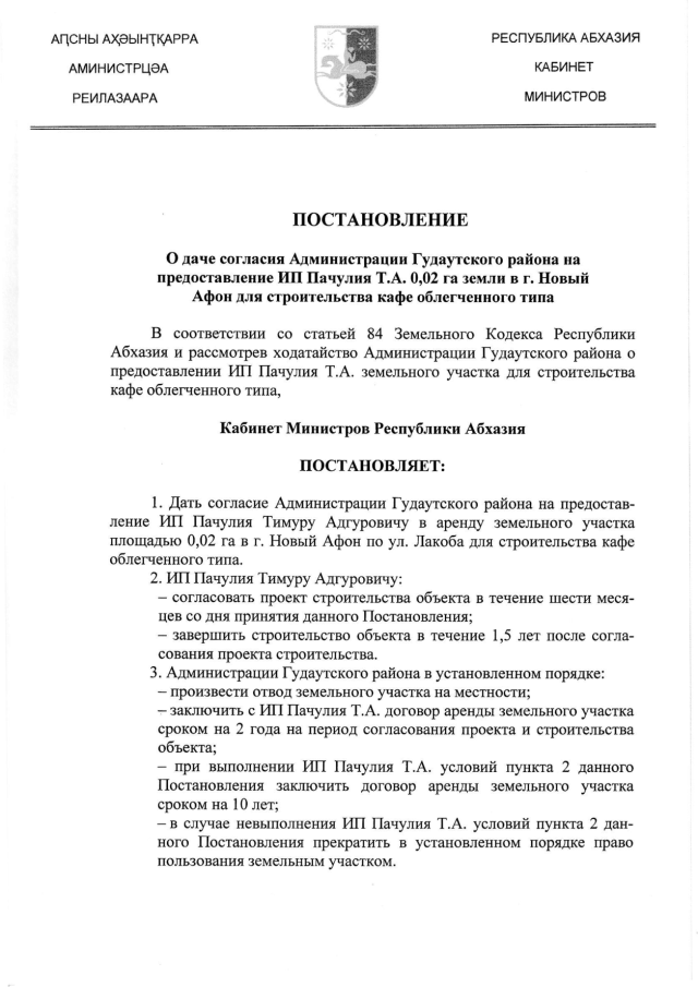 Постановление Кабинета Министров Республики Абхазия от 14.07.2016 № 127 "О даче согласия Администрации Гудаутского района на предоставление ИП Пачулия Т.А. 0,02 га земли в г. Новый Афон для строительства кафе облегченного типа"