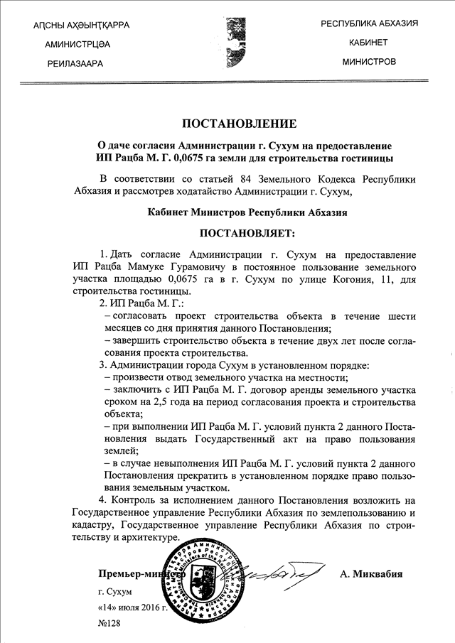 Постановление Кабинета Министров Республики Абхазия от 14.07.2016 № 128 "О даче согласия Администрации г. Сухум на предоставление ИП Рацба М.Г. 0,0675 га земли для строительства гостиницы"