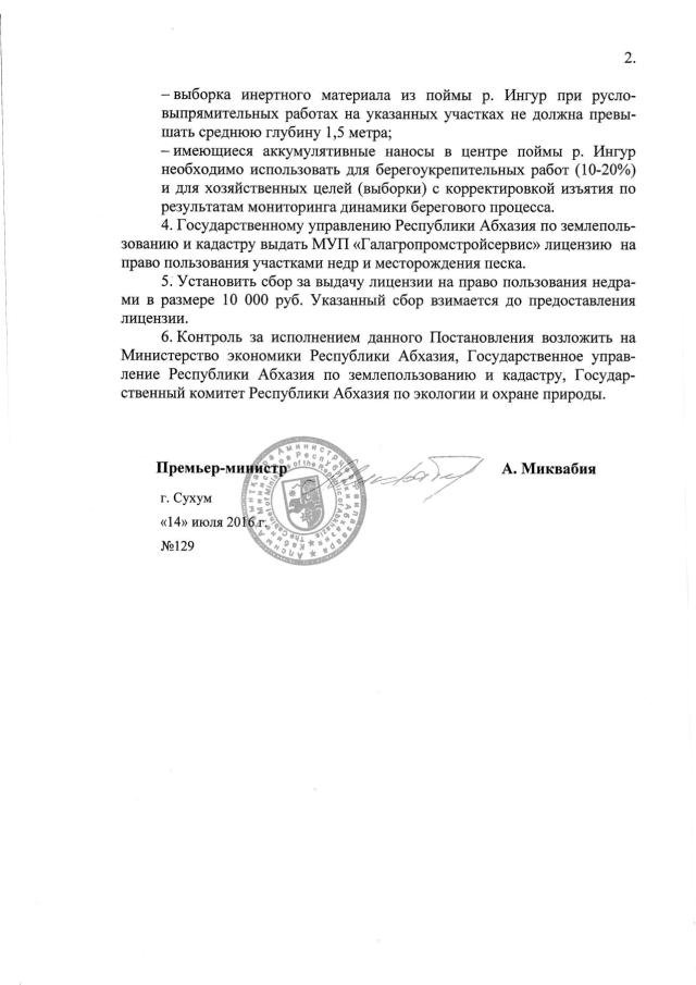 Постановление Кабинета Министров Республики Абхазия от 14.07.2016 № 129 "О предоставлении МУП "Галагропромстройсервис" права пользования участками недр в пойме реки Ингур и месторождения песка в с. Гуда Галского района для добычи песчано-гравийной смеси"