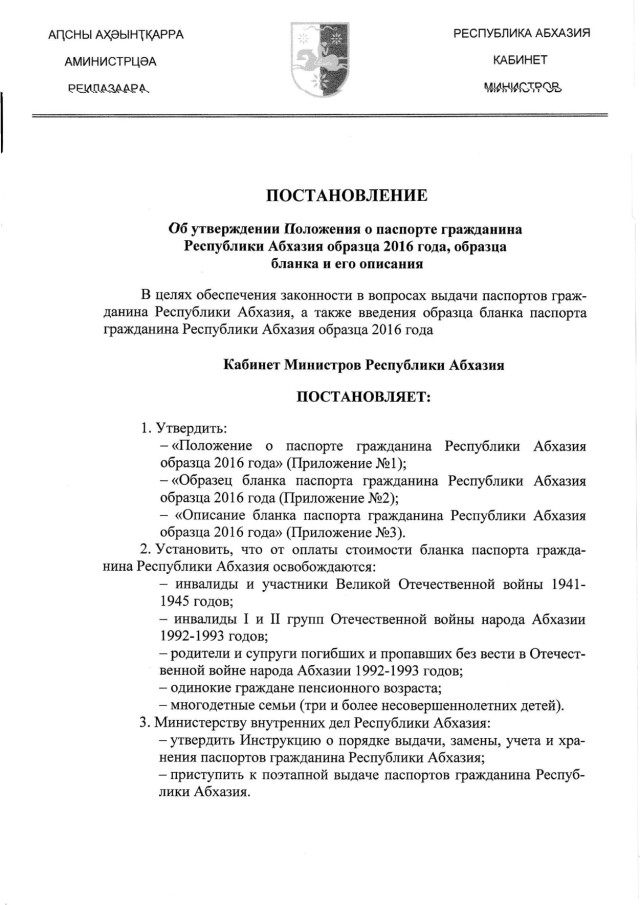 Постановление Кабинета Министров Республики Абхазия от 15.07.2016 № 133 "Об утверждении Положения о паспорте гражданина Республики Абхазия образца 2016 года, образца бланка и его описания"